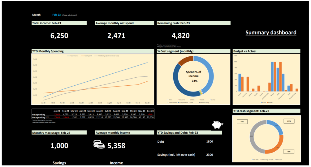 Our Excel template is specifically designed to track every aspect of your personal spending. Whether it's food expenses, home expenses, personal living expenses, transportation costs, utilities, health expenses, charity contributions, entertainment indulgences, savings, debt management, income tracking, or insurance expenses, our tracker has got you covered!